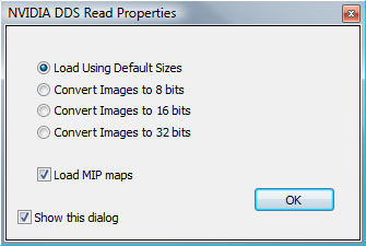 3.Now the plug-in ask you about the read properties of the file. We'll choose the settings shown below. If you want to import the image without MIP maps, just uncheck the Load MIP maps.
