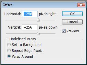 Now it's time to flatten the image. Otherwise the thing we are going to do next will not work. Now let's make this image tilable. The easiest way to do this is to apply an Offset filter. (Filter ? Other ? Offset...) With this filter we can move the image to any coordinate in our canvas and it automatically starts to tile itself. Here's what it looks like with Offset's horizontal and vertical set to 256, 256. (Make sure wrap around is on.)
